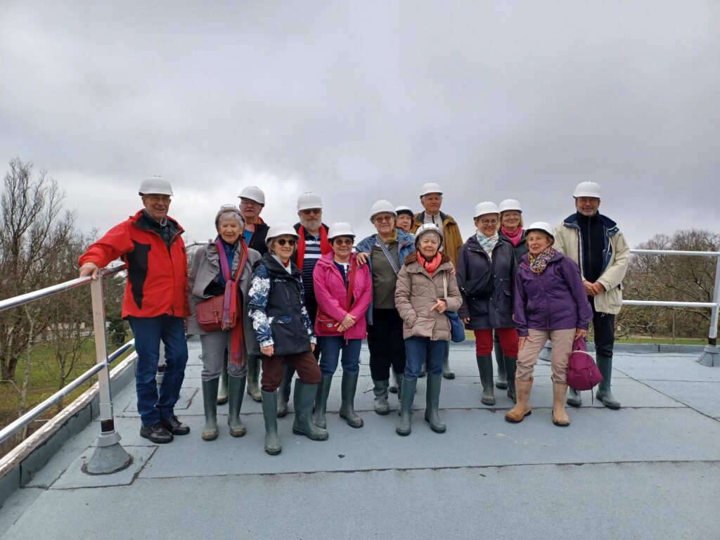 Une centrale de traitement d’air régule, avec l’aide de la géothermie, les températures intérieures ainsi que la production d’eau chaude sanitaire. Elle est alimentée par la production électrique de la toiture. Nous avons pu voir la gaine principale d’air de 2m x 3m de section. Les soufflages se trouvent en périphérie de la grande salle contre les parties vitrées : désembuages.