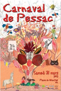 15h, de nombreux enfants sont installés sur notre char, armés de confettis pour arroser le public. Et c’est enfin le départ aux sons des tambours et autres trompettes. En-tête ‘Monsieur Carnaval’ qui ne serait pas si pressé s’il savait ce qui allait lui arriver. Le cortège vire à droite, direction le passage souterrain, puis passe devant la Cité Arago pour se diriger vers le parc de Camponac pour passer devant le jury des élus pessacais.