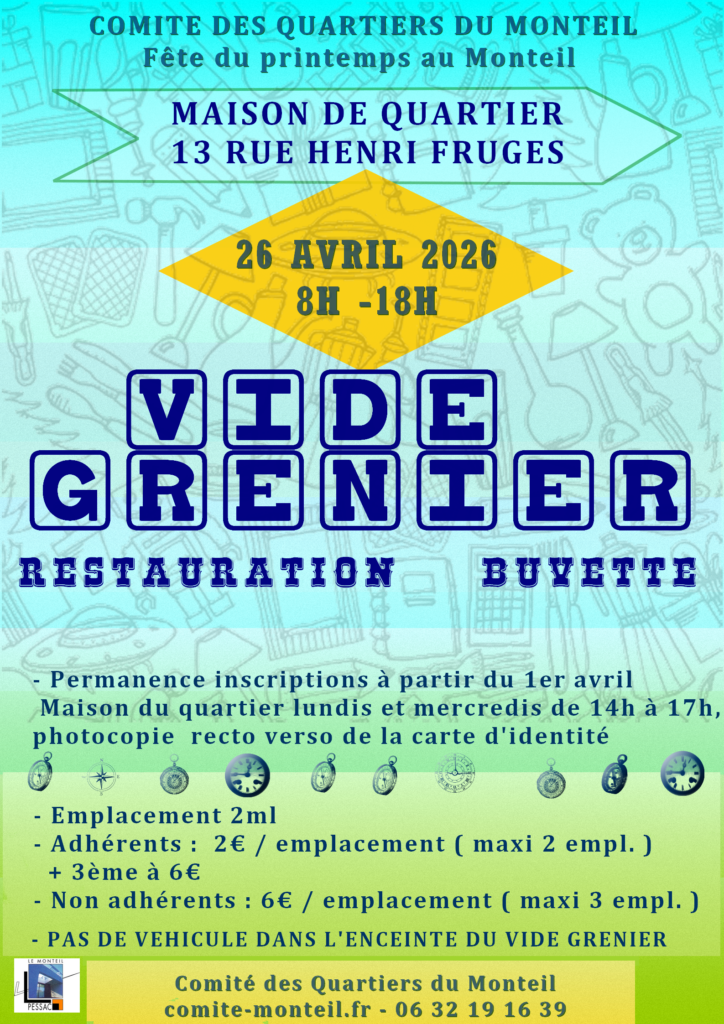 Vide-greniers Fête du Monteil dimanche 26 avril 2026 par Jean Luc Renault · 11 mars 2026 Inscriptions http://comite-monteil.fr/wp-content/uploads/2026/03/Bulletin-inscription-VG.pdf