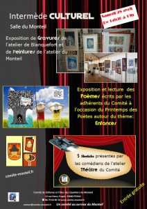 Pour la deuxième année, l’intermède culturel du Monteil a enchanté les adhérents présents. Les expositions de gravures de Lolita Pugibet, les tableaux des talentueux peintres de notre atelier, responsables « Jacques Roul et Sylvie Bayle », et les jolis poèmes écrits par nos adhérents, responsable « Sylvette Impératori », ont montré une nouvelle fois que la richesse de la culture au Monteil n’est pas un vain mot. Nous avons ensuite apprécié la jeune troupe théâtrale qui a su nous divertir et nous faire rire avec leurs sketches écrits par Dominique Nevouet . Ces acteurs ont été dirigés par Dominique et Renée Duleu. Ils ont su nous divertir malgré le tract et nous ont présenté un très joli spectacle. Des poèmes variés sur le thème de « l’Enfance » ont été écrits par nos adhérents, et déclamés par certains bénévoles et par les membres de l’atelier théâtre, tous ont été très applaudis. Sylvette Imperatori a remercié tous les poètes pour leur participation et nous a donné rendez-vous pour l’année prochaine. Martial Mouflin était à la sono et Jean-Claude Cahuzac était accessoiriste. Nous avons eu la présence de Mme De Beaulieu qui représentait la mairie. Jean-Claude Juzan a souligné les nombreuses activités du comité faites au Monteil et l’importance de nos ateliers culturels Il a remercié tous les acteurs de cet intermède et les spectateurs venus nombreux malgré le mauvais temps, puis il nous a invité à boire le verre de l’amitié. Une sympathique auberge espagnole a suivi ces festivités ou nous avons essayé de chanter tant bien que mal au Karaoké. Belle soirée à renouveler !! (Hélène Mouflin)