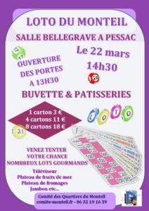 LOTO du 22 mars 2026 à 14h30 salle BELLEGRAVE à PESSAC par Jean Luc Renault · 2 mars 2026 http://comite-monteil.fr/wp-content/uploads/2026/03/AfficheLotoPessac-1.png